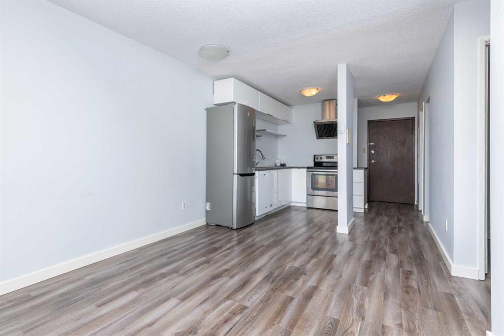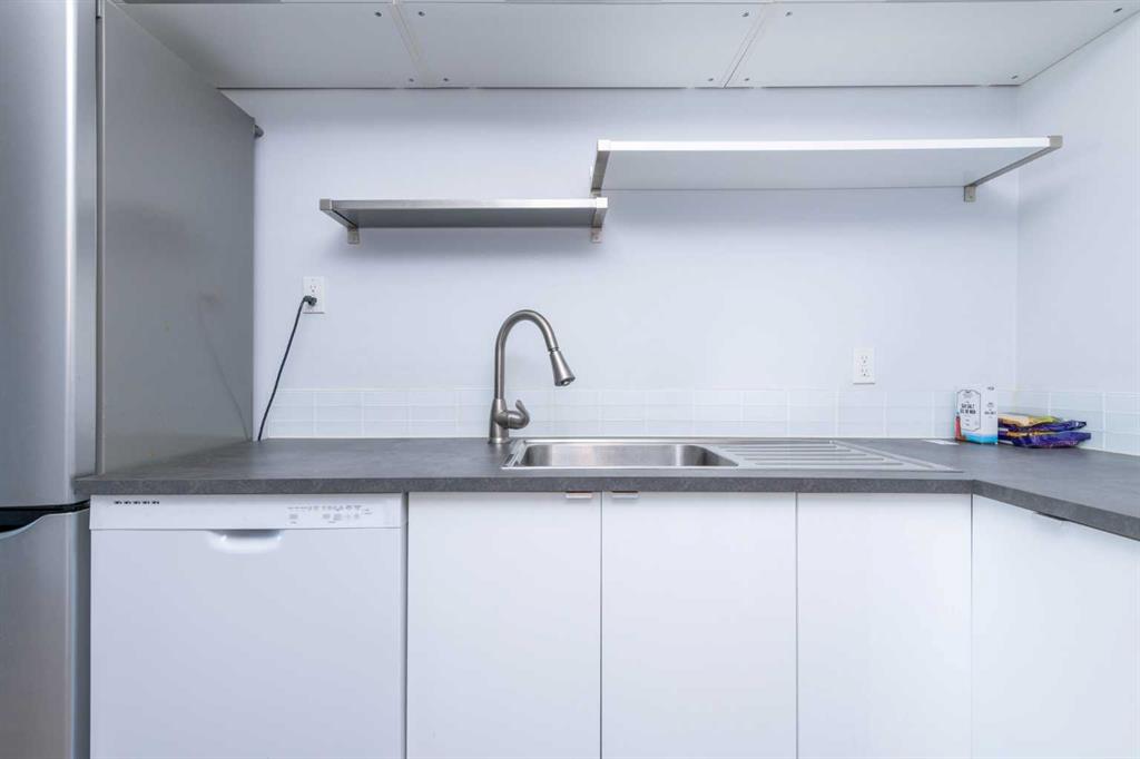 This third-floor apartment features modern stainless steel appliances, a commercial-style hood fan, and sleek cabinetry with open shelving. Contemporary flooring and sof... MLS®: A2297004 - Sunalta Apartment-Single Level Unit $149,900